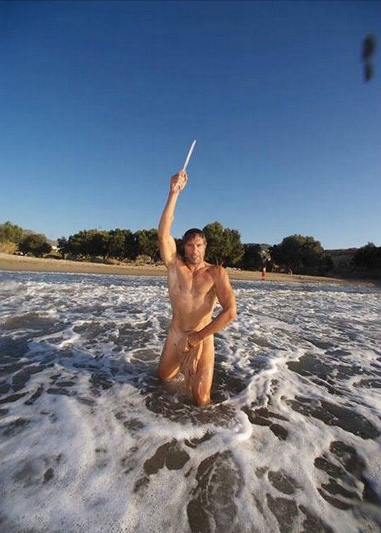 Μάλιστα, στο ένα του χέρι κρατούσε ένα σπαθί και τη φωτογραφία συνόδευσε με τη λεζάντα: "Warrior-confronting the stream-λουόμενος εν Πάρω".