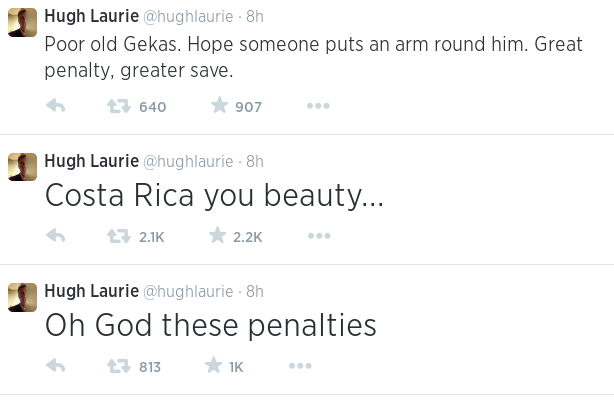 Ξεκίνησε γράφοντας «Ω Θεέ, αυτά τα πέναλτι» συνέχισε με τη σημείωση «Κόστα Ρίκα ομορφιά» για να κλείσει με ένα τουίτ αφιερωμένο στον Φάνη Γκέκα «Καημένες γερο- Γκέκα. Ελπίζω κάποιος να τον αγαπήσει. Σπουδαίο πέναλτι, σπουδαιότερη διάσωση».
