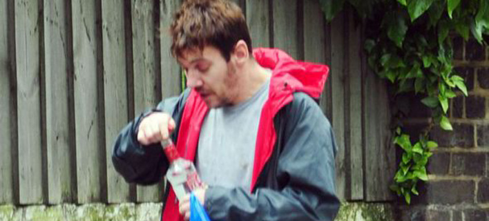 Αξύριστος, με βλέμμα χαμένο και παραπανίσια κιλά, περπατάει στο δρόμο κρατώντας ένα μπουκάλι βότκα.